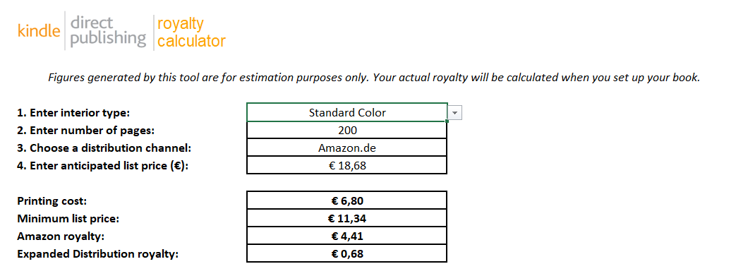 Bei einem Listenpreis von 19,99€ können wir mit dem Standard-Farbdruck bereits 4,41€ Tantiemen erhalten, und bei dem gleichen Preis mit dem Schwarz-weiß-Druck bekommen wir mit 8,21€ sogar fast das doppelte an Tantiemen heraus.