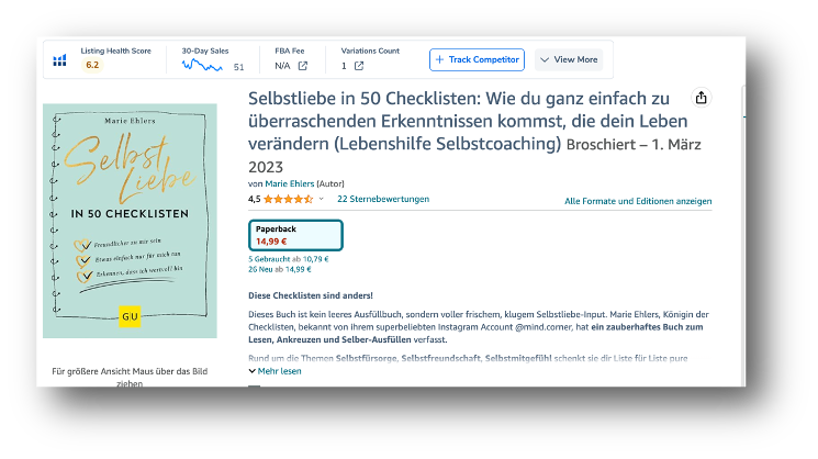 In den letzten 30 Tagen hat sich das Buch 3.108-mal verkauft. Wenn wir wieder davon ausgehen, dass 5€ Tantieme übrigbleiben, können wir davon ausgehen, dass die Person, der das Buch gehört 15.540€ mit dem Buch verdient hat. Und das in einem Monat!! Richtig. Für so viel Geld arbeitet manch Angestellter mehrere Monate lang. Natürlich gibt es auf der anderen Seite Ausgaben für Werbekosten, aber selbst, wenn wir einmal davon ausgehen, dass diese Werbeausgaben 50% betragen, bleibt trotzdem noch ein ziemlich hoher Betrag am Ende übrig.